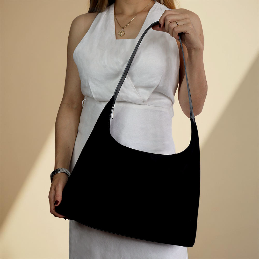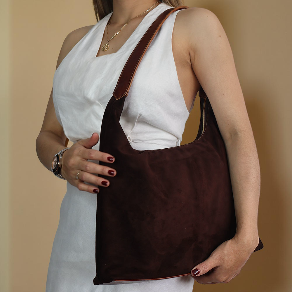 El Bolso Bruma es una expresión de sutileza y carácter. Confeccionado en gamuza de textura suave y profunda, combina elegancia y funcionalidad en un diseño de líneas limpias y proporciones equilibradas. Su superficie aterciopelada capta la luz con delicadeza, mientras sus acabados y costuras resaltan la maestría del trabajo artesanal.