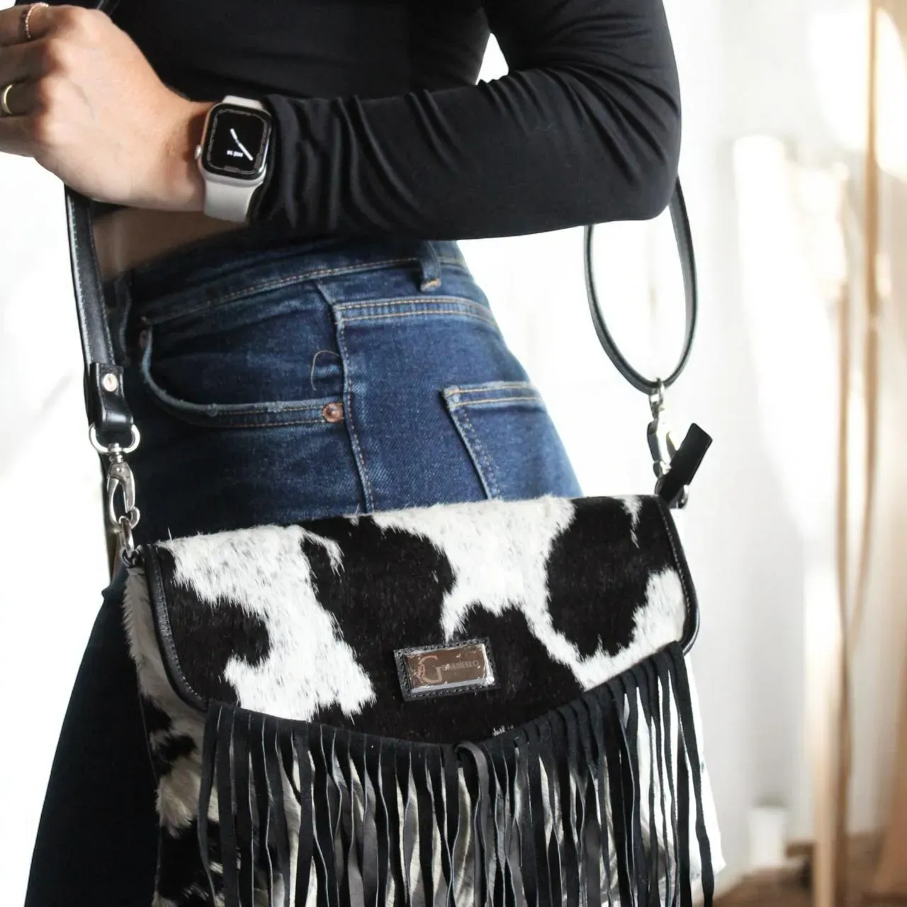 Este bolso combina el carácter salvaje del pelo natural con la elegancia del cuero bovino, en un diseño único y detalles en flecos. Ideal para quienes buscan un accesorio audaz, artesanal y con un estilo inconfundible.