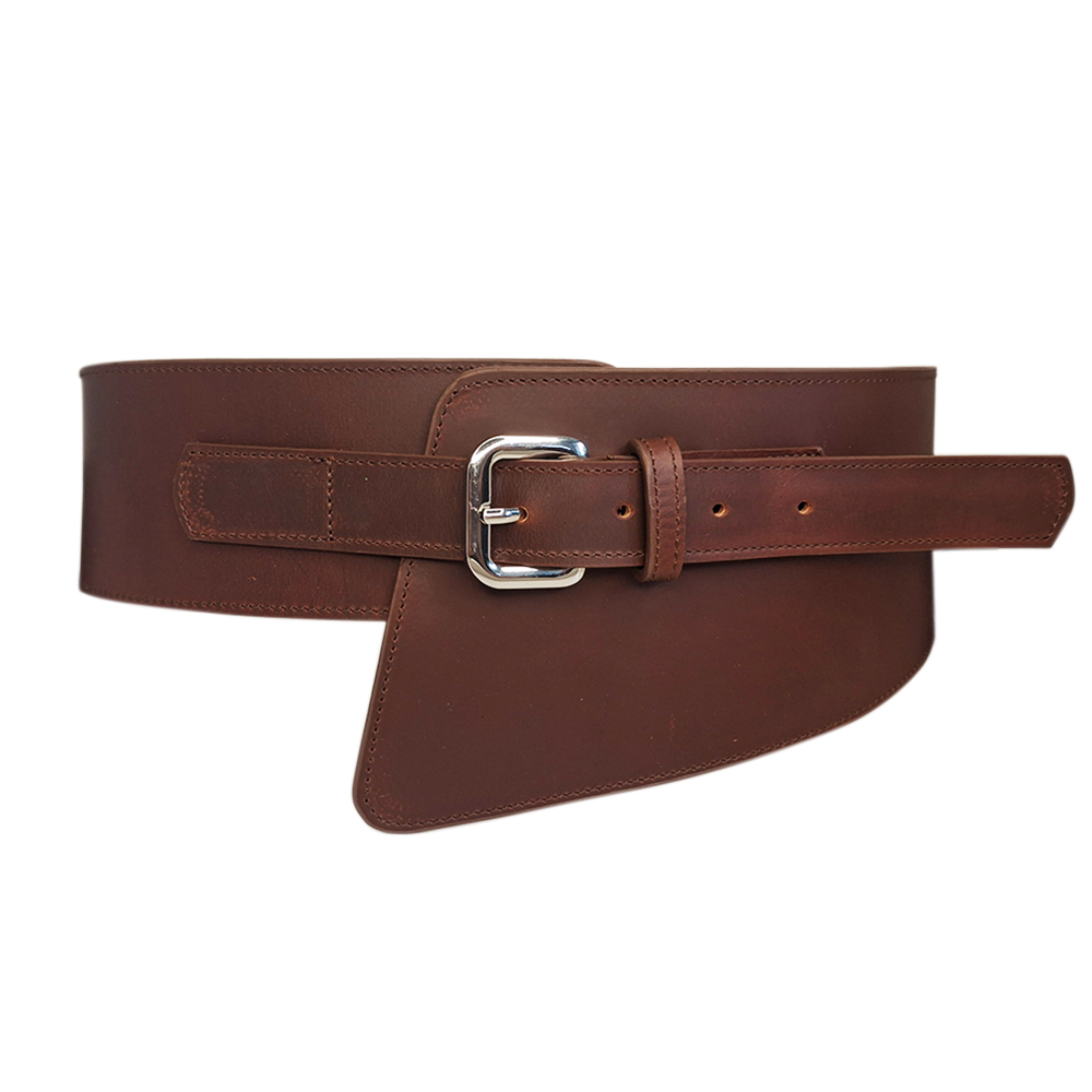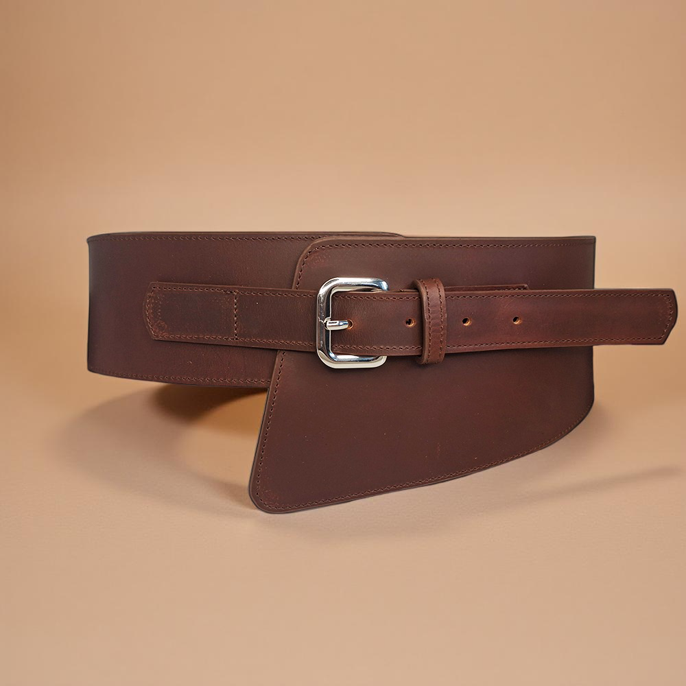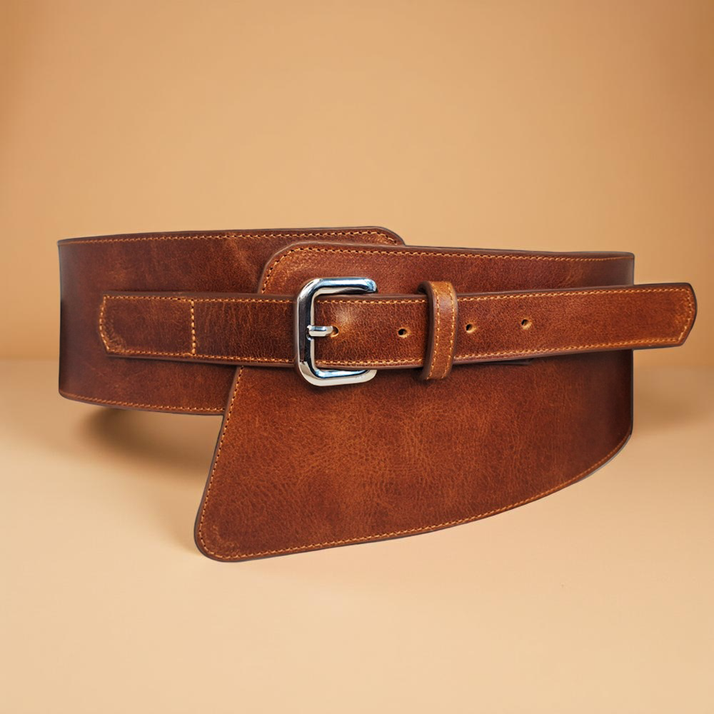 Corte envolvente, textura noble. Este cinturón en cuero liso y tonos tierra es una pieza versátil y elegante, perfecta para acentuar la cintura con discreta firmeza.