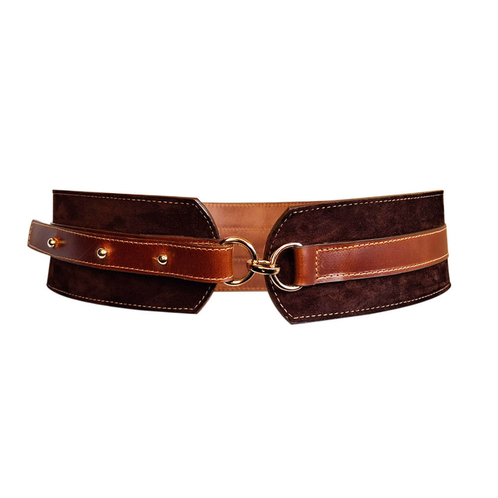 El Cinturón Malva combina la fuerza del cuero con la textura aterciopelada de la gamuza, creando una pieza llena de carácter y distinción. Su diseño resalta una base amplia en gamuza y una franja superior en cuero liso, unidas al centro por aros metálicos entrelazados que aportan un toque de refinamiento.