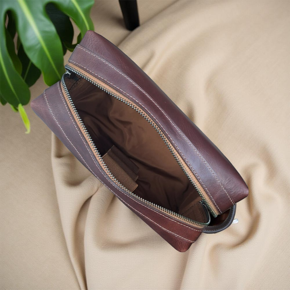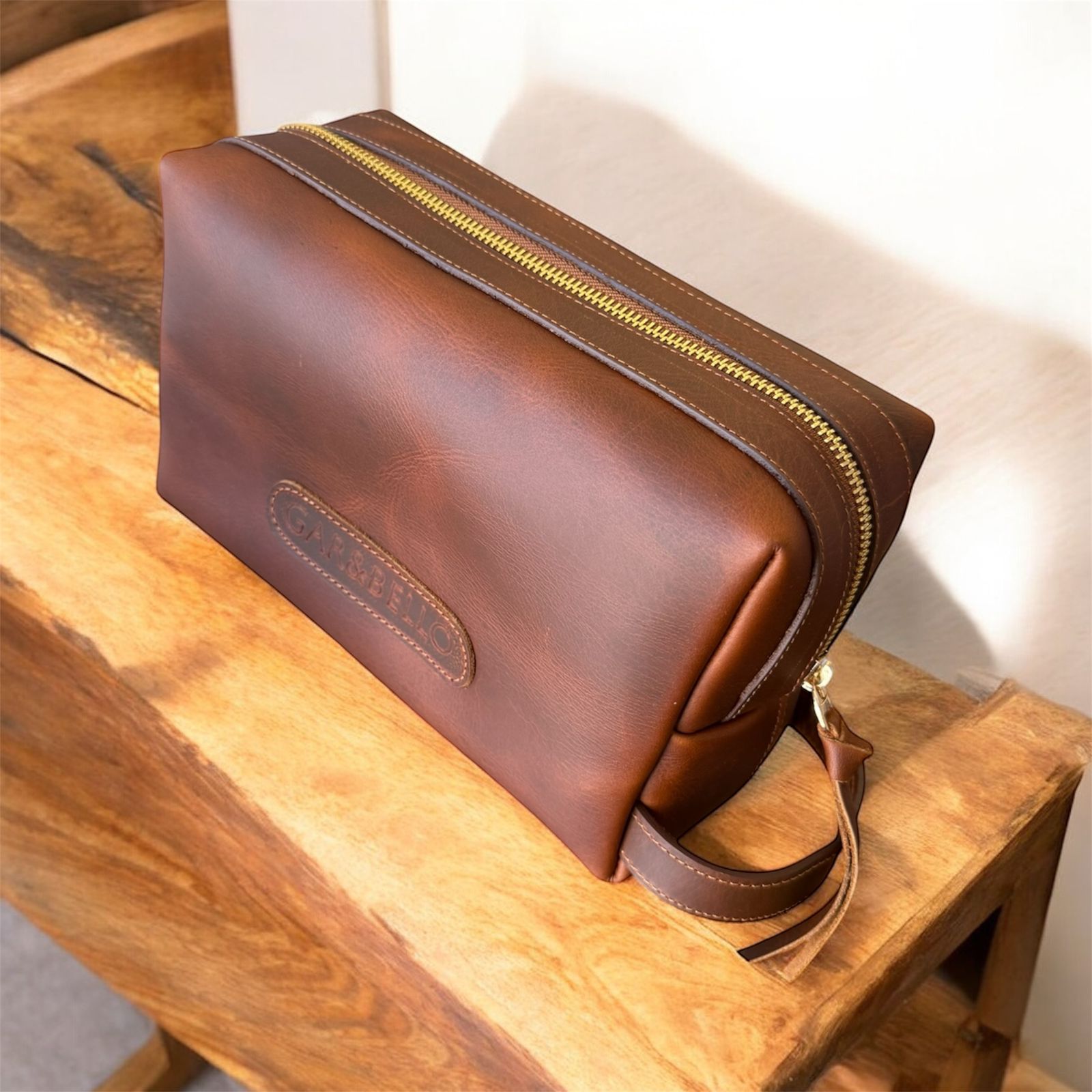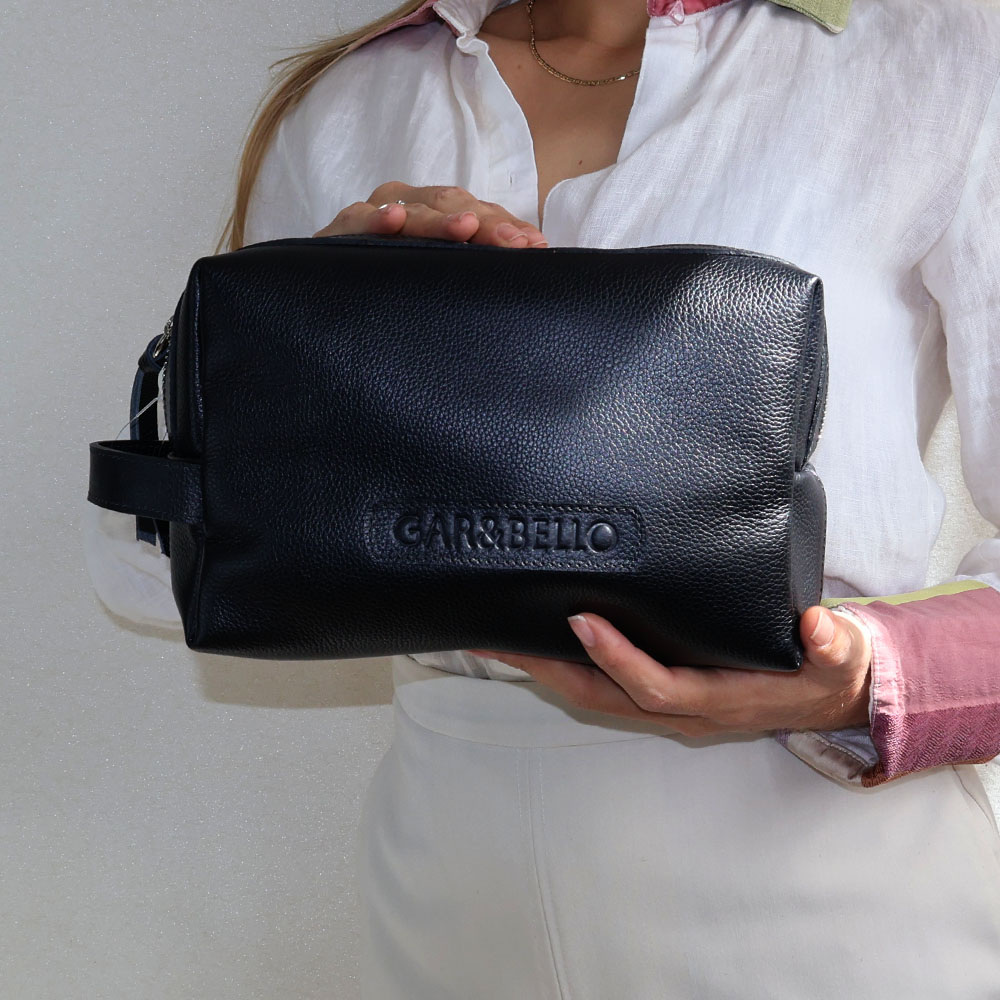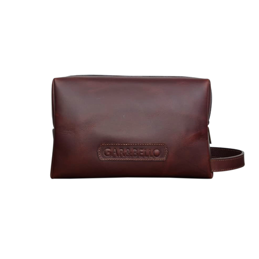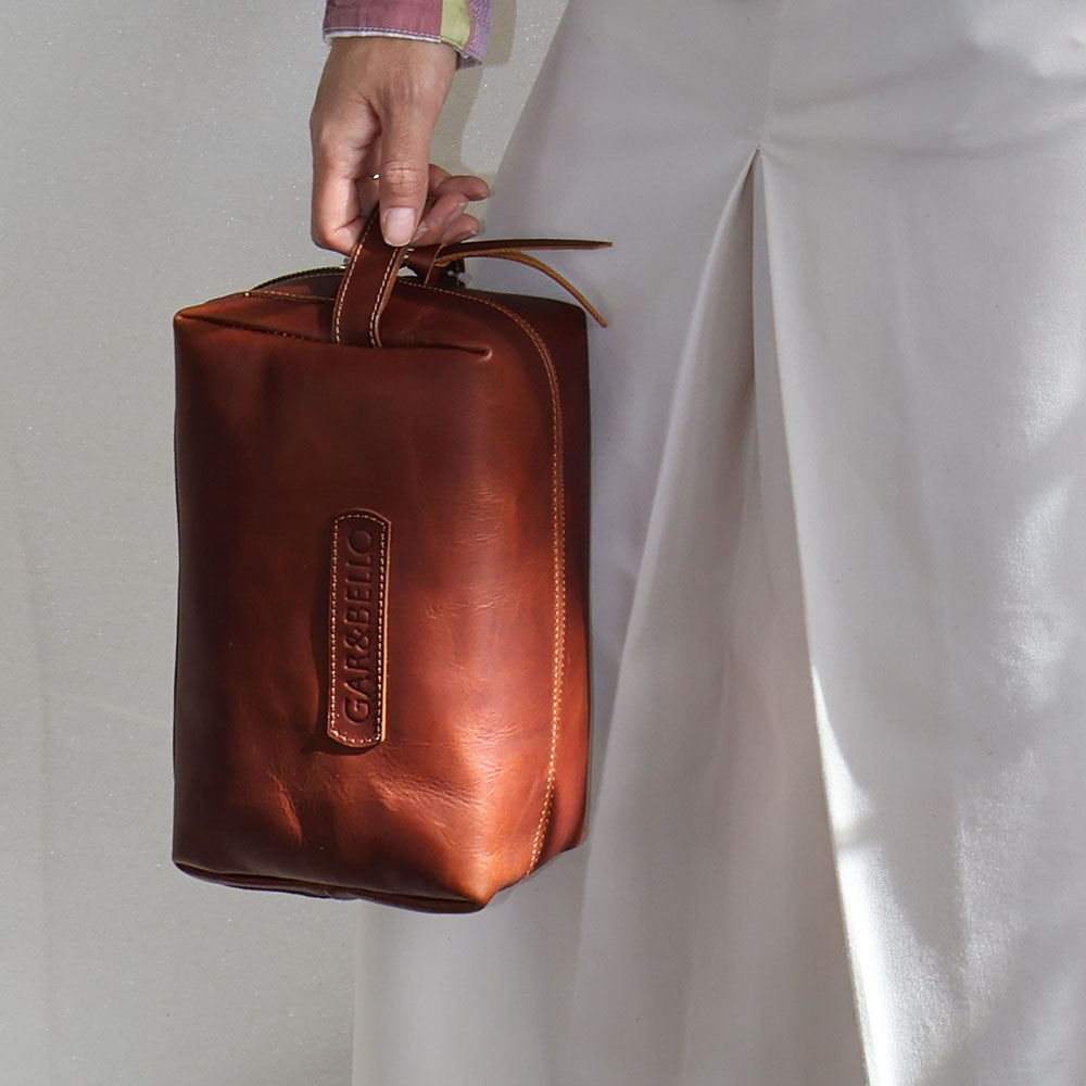 Este estuche está elaborado en cuero genuino de alta calidad, presenta un diseño elegante y funcional. Su acabado en un tono marrón rico y natural resalta la textura característica del cuero, con detalles sutiles como costuras reforzadas y un cierre de cremallera robusto. La etiqueta grabada con el nombre “GAR&BELLO” añade un toque personal y sofisticado. Ideal para guardar artículos de aseo o accesorios, incluye una asa práctica para facilitar su transporte.